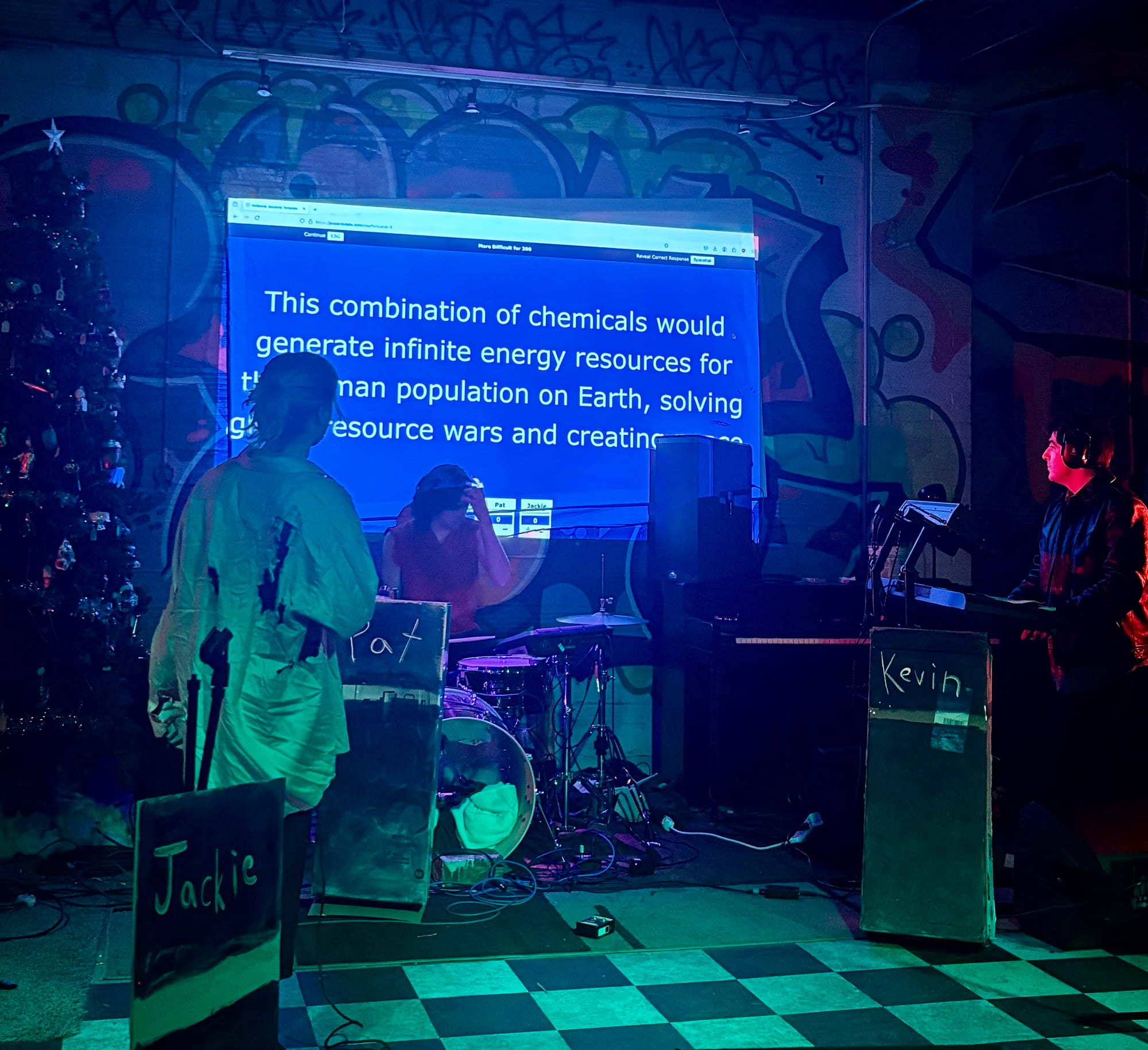 Patrick Apfelbeck: And the band that played that show was just the original lineup without Jackie. That was our original synth player and our bass player. And then Jackie had a dream about playing a contact mic attached to fruit in a blender live at The Comet, and she posted about it in this Facebook dream journal collective group. Me and the other people in that band just reached out and were like, “Oh, this sounds pretty dope. Let’s like, try and do it for real.” Since that first set already had a skit-slash-gimmick attached to it, it was an easy thing to keep following up on and iterating on. I know Kevin from playing in another group, Fourth Wife