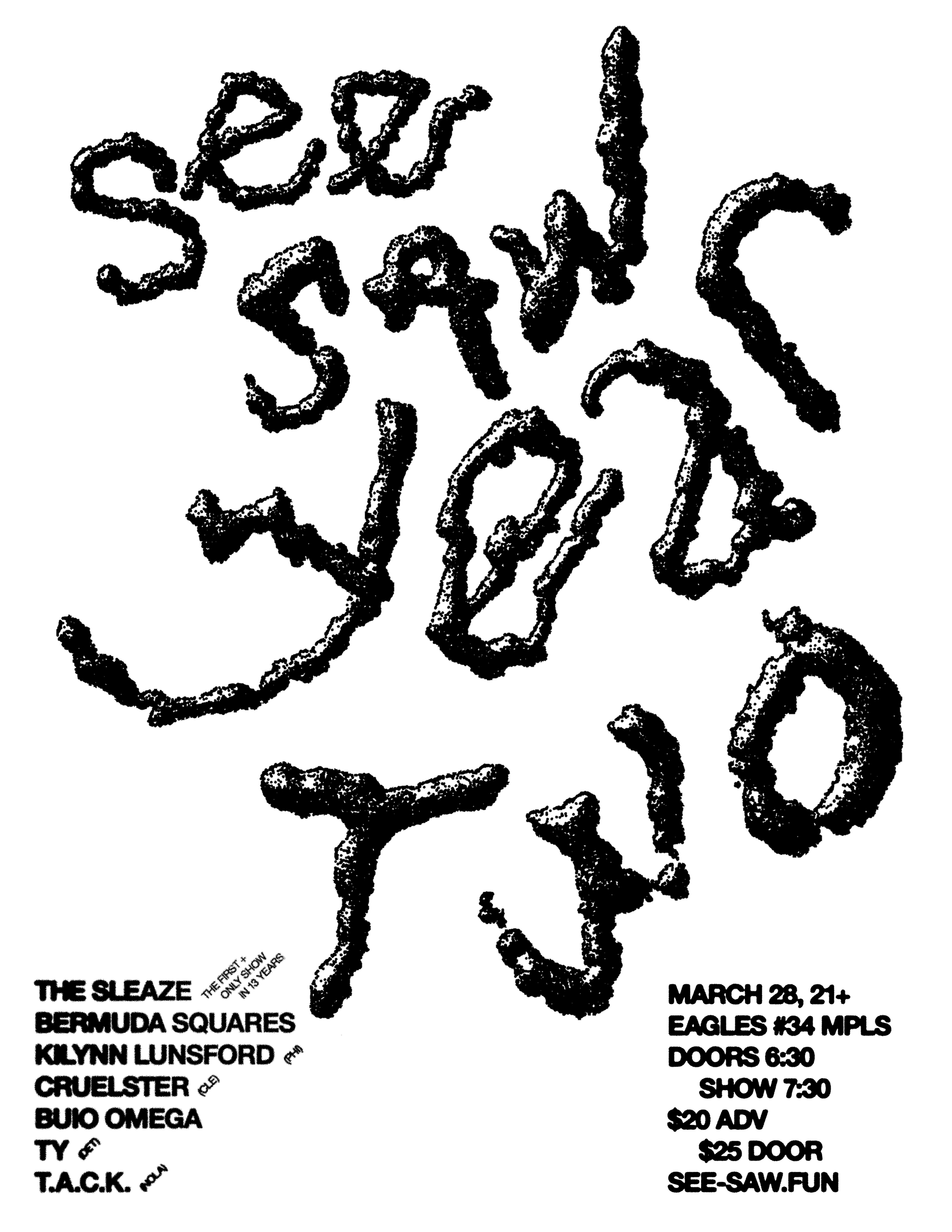 Last year at Eagles #34 in Minneapolis, I threw a birthday party for see/saw. It was seven bands in two rooms—a power bill. I threw two parties beforehand, too—both power bills. Sometime that week, Greer from BUIO OMEGA told me “we’ll play year 2.” A few people told me they were excited about year 2. At some point it just seemed like a given that I’d do year 2. Today, tickets are on sale for year 2.