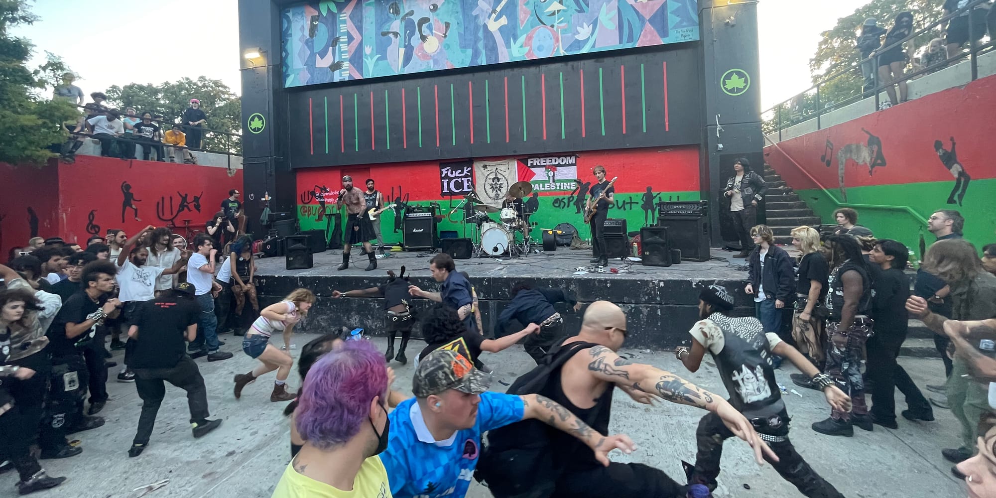Tucked inside the bandshell bowl at Herbert Von King Park in Bed-Stuy, Brooklyn, I look up from my phone to find myself in a sea of black clothing, tattoos, and body odor. A smattering of families with toddlers hover just outside the pervasive clouds of smoke. It’s the early evening of September 11, 2025, and the band has just finished setting up. Signs declaring “FUCK ICE” and “FREEDOM PALESTINE” adorn the back wall of the stage. When Nader Habibi strolls onto the stage in a long black kilt, the guitars ring out and the mood shifts. The pit opens up, and a scowling punk with flowing curly hair ignites an Israeli flag. It’s time for Haram.