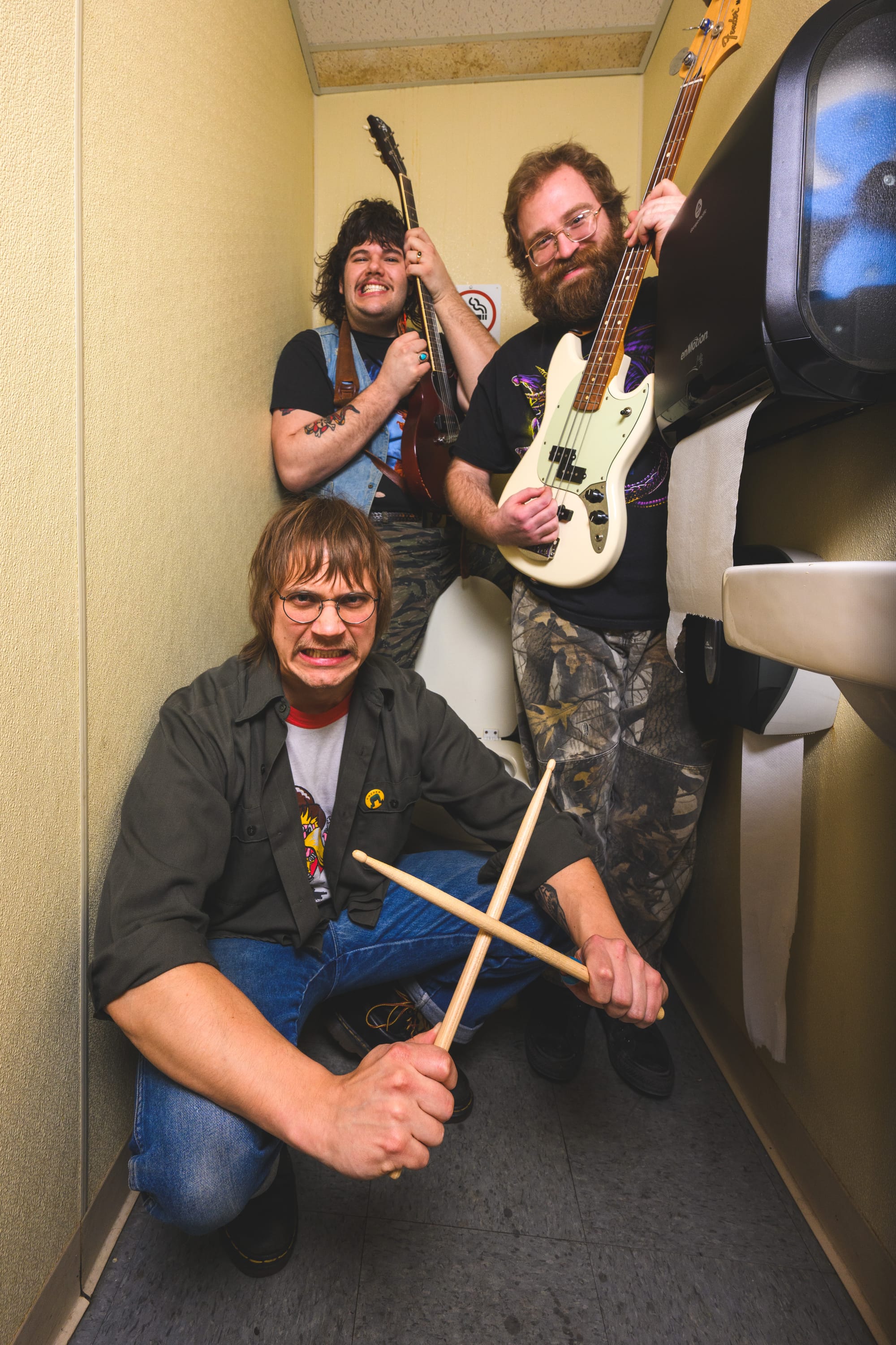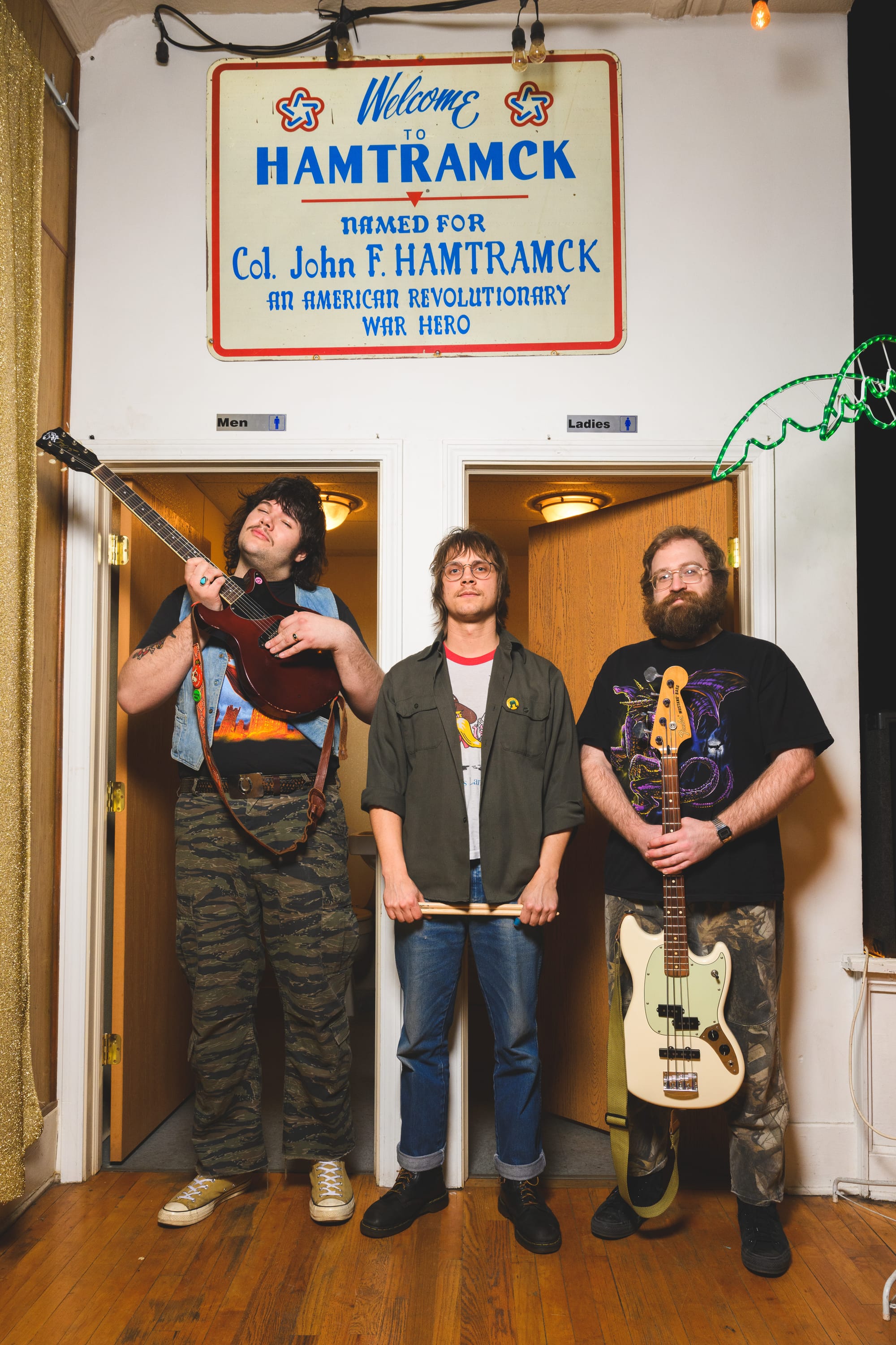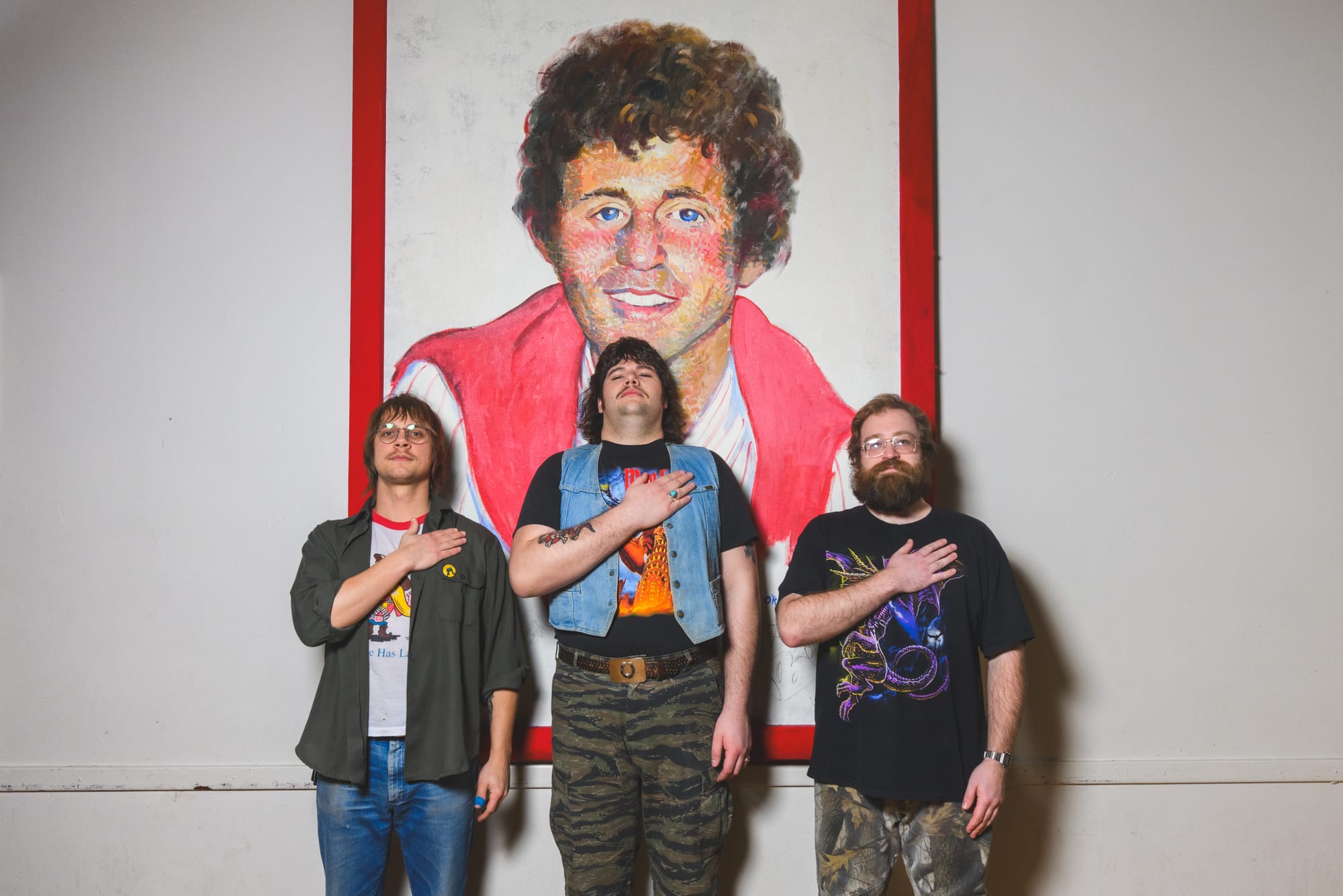 Following the interview, photographer Doug Coombe sets up a light stand and the band jokes about how much more official the shoot is than they expected it to be. They successfully extract every ounce of humor from the near-empty room. They stand, hands on hearts, in front of the Bobby Vinton painting in a touching tribute. They silently do rock poses onstage—a sort of alien impression of themselves. Not even the comically small men’s room is safe.